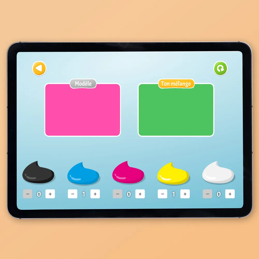 Design des interfaces pour un jeu de mélange de couleurs pour enfant. Le joueur doit mélanger les 5 couleurs primaires pour recréer la teinte demandée.